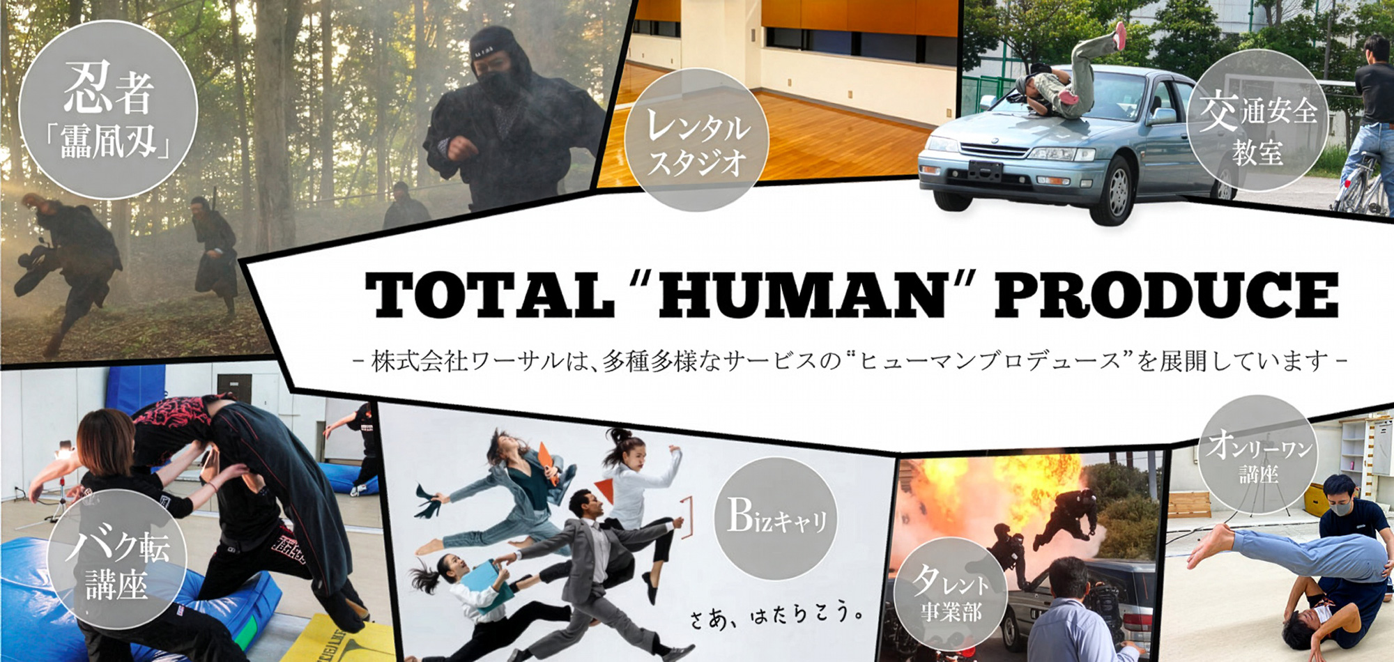 現場で活躍できる俳優・アクションタレントの発掘(タレント事業部)、伊賀忍者の本拠地である三重県伊賀市でのイベント企画運営や出演による、世界各国への忍者普及活動(忍者「靁凮刄」、福岡黒田忍者隊)を行っております。